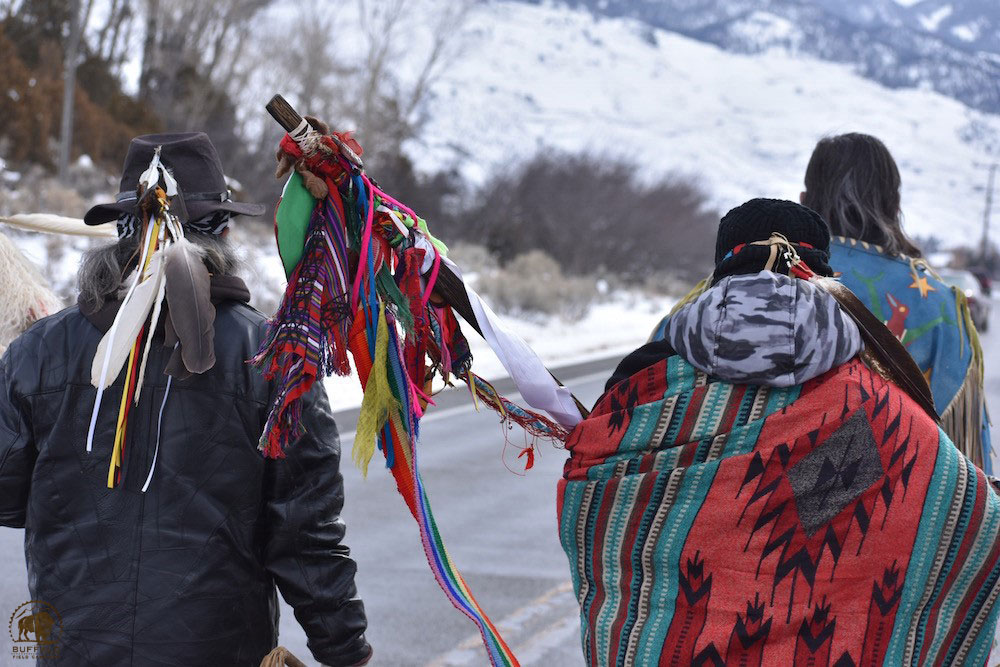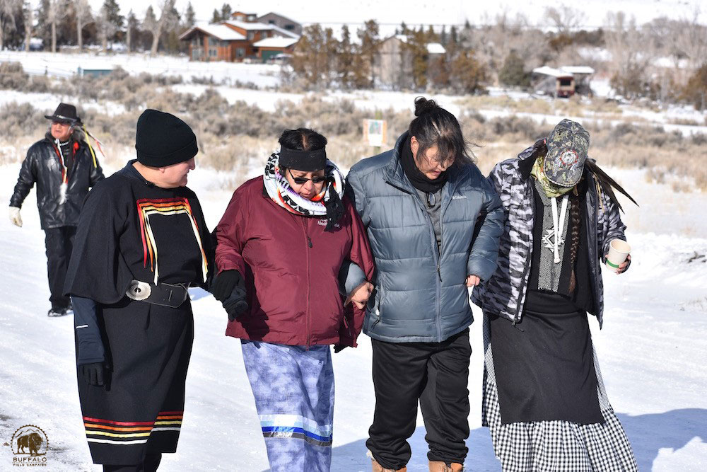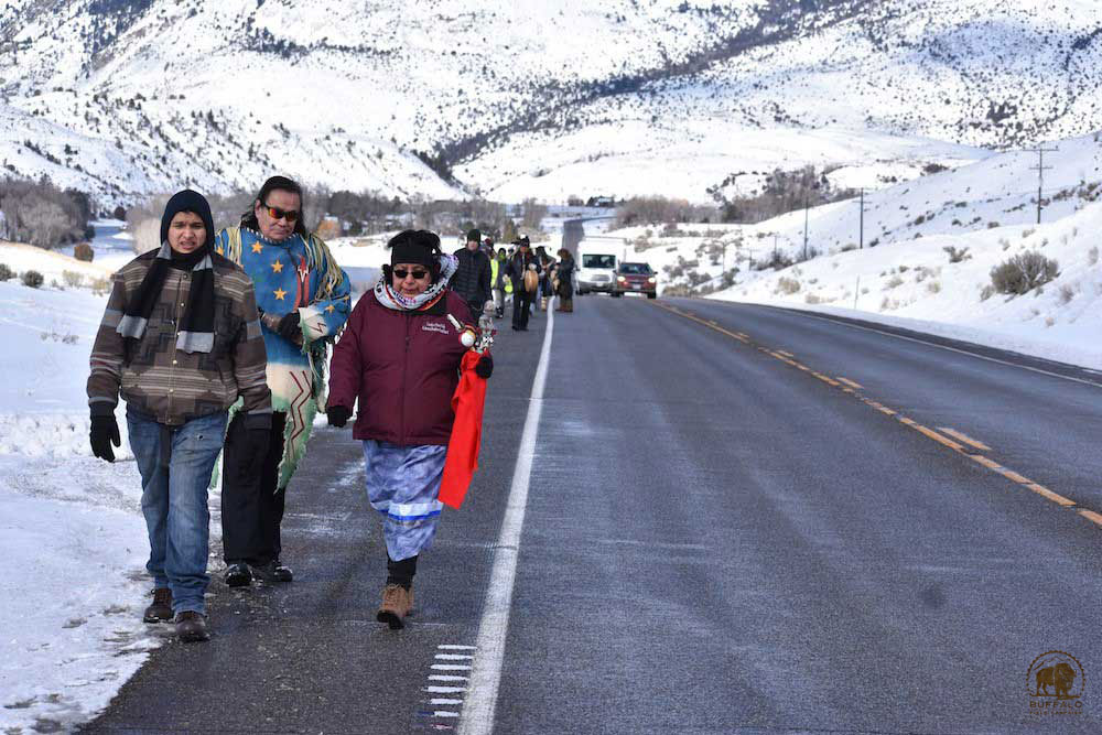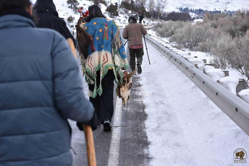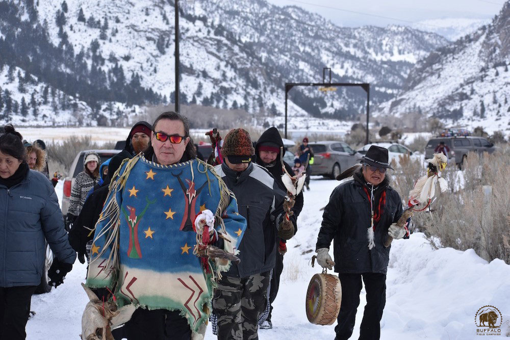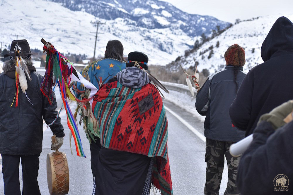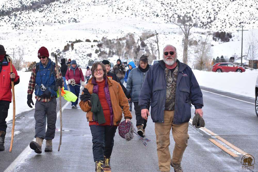 On Friday, February 14, more than 40 of us gathered near Yankee Jim Canyon in Montana’s Gardiner Basin, to commence the 3rd Annual Rosalie Little Thunder Memorial Walk. This walk is our way of paying homage to our co-founder, Rosalie Little Thunder, Sicangu Lakota Oyate, who, in 1999, walked 500 miles from Rapid City, South Dakota, all the way to the Gardiner Basin in Montana. Rosalie’s walk was a form of prayer for the buffalo and protest against their senseless slaughter. Rosalie passed away in 2014, so this walk is our way of keeping her memory alive and honoring all the incredible work she did — and continues to do from the Spirit realm — for the last wild buffalo. Friends, relatives, and loved ones of Rosalie’s braved treacherous winter road conditions to come together to honor this amazing woman. We met up near Yankee Jim Canyon, near the north end of the Gardiner Basin, where we would walk south to Beattie Gulch, right at Yellowstone National Park’s north boundary. Recognizing we were to complete a mere fraction of Rosalie's achievement, with an 11 mile walk, we shrugged off the blizzards and icy roads we traveled through, as well as the cold and wind in the air, and any ailments people were feeling.