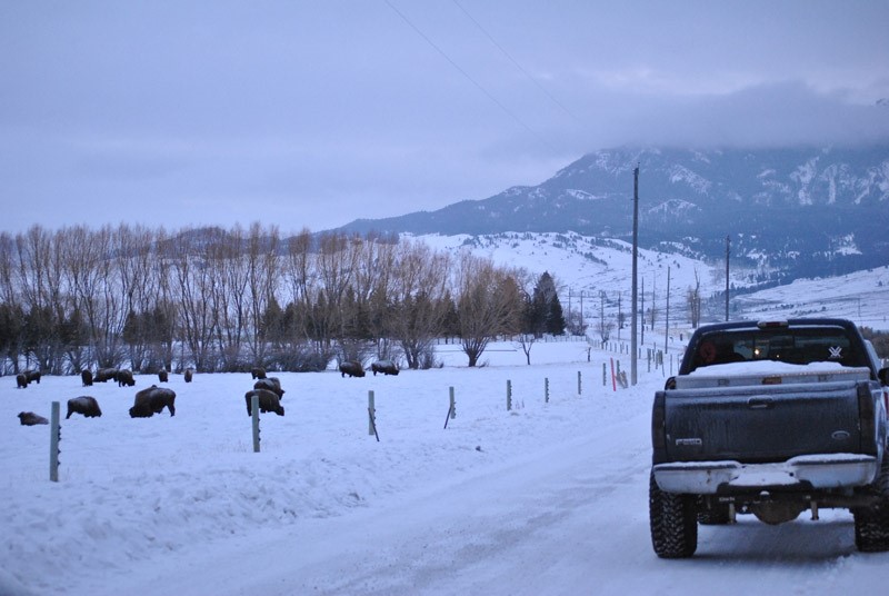 Hunters park along Yellowstone’s northern boundary, waiting for buffalo to leave private land. The buffalo seen here are off limits to treaty hunters, and state hunters need landowner permission to shoot them. Photo BFC/Stephany