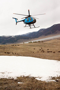 Today's hazing operation, like those throughout this week, push bison from Horse Butte deep into Yellowstone National Park, using a helicopter and mounted horsemen (photo by Lance Koudele). Bison will be chased to areas seven to twenty miles within Yellowstone National Park's interior. In the past three weeks government officials have commenced large-scale hazing operations on Gallatin National Forest, where there are no cattle, disrupting the ecosystem while forcing wild bison - including many newborn calves - off of their spring calving grounds deep into Yellowstone National Park. Agents use horses, snowmobiles, ATVs, and a helicopter to coerce the buffalo.