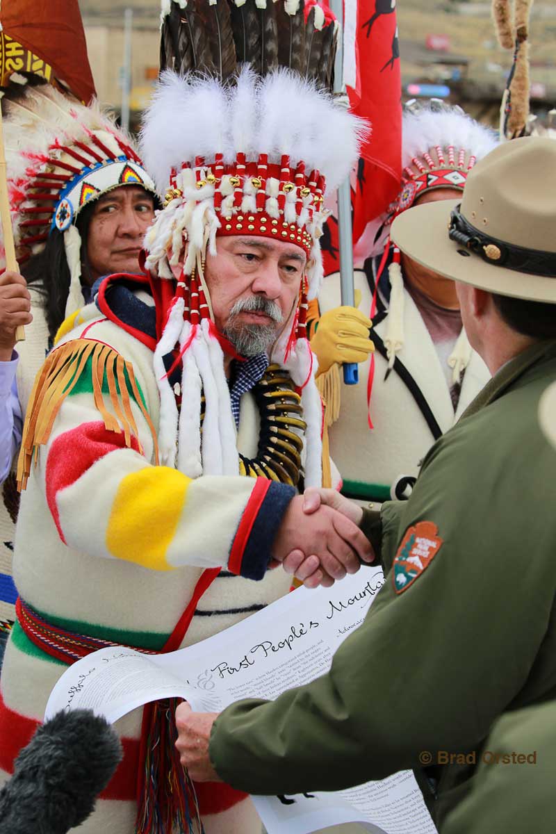 Chief Grier presents Yellowstone Deputy Superintendent Pat Kennedy with the name change declaration. Photo courtesy of Brad Orsted.