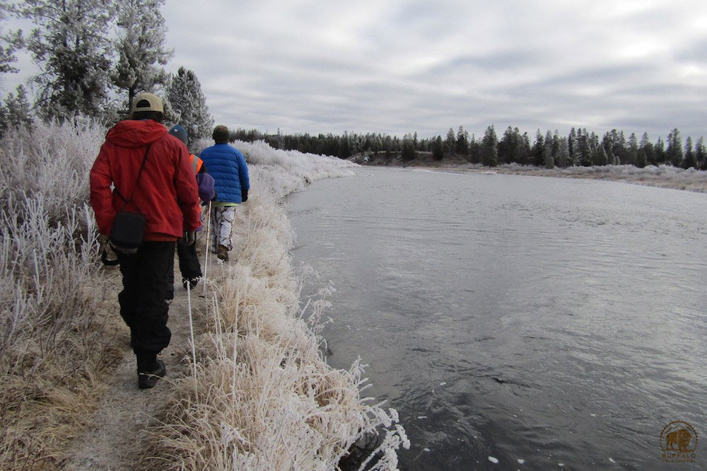 BFC volunteers do a recon, looking for wild buffalo along the Madison River. Photo by Frances Buchanan, Buffalo Field Campaign.