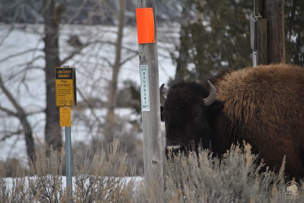 A mama buffalo about to cross the imaginary line from Yellowstone’s north boundary into the “kill box” of Beattie Gulch. Photo by Stephany Seay, Buffalo Field Campaign.