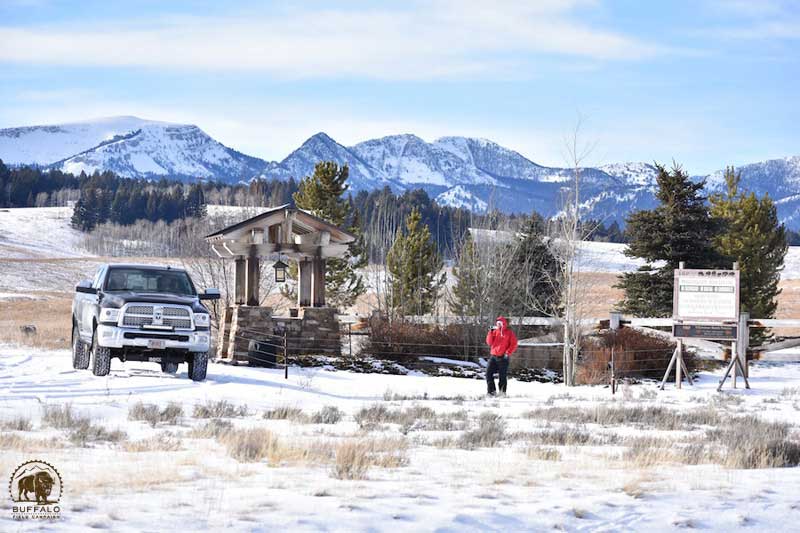 Late last week, a crazy thing happened. The buffalo moved just off the Galanis’s property — the largest buffalo safe zone in Montana — onto the public portion of Horse Butte (Gallatin National Forest), where they could be killed by hunters. With so little snow, though, snowmobiling isn’t really feasible, and most hunters won’t work hard for their kills. We thought the buffalo would be safe because, generally, hunters are lazy and there was no way anyone was going to walk all the way around Horse Butte to shoot, field dress, and drag out a buffalo. We were both right and wrong. Our patrols spotted a state hunting party who appeared to be accessing the buffalo through the Galanis’s. We were shocked because we knew the Galanis’s would never allow this. We received phone calls from friends in the Village, we were hearing crazy chatter over the radios, and we immediately called Grandma, our dear friend and close contact with the Galanis’s, to find out if they had given permission for this. We soon learned it was the Galanis’s ranch manager who had granted permission, and wanting to take the easy way out, they wanted to bring the dead bull they killed back through this safe zone. Grandma asked that our patrols watch the hunt party, and get footage and photos should they bring the dead bull through the front gate, where an enormous “Buffalo Safe Zone” sign is posted. We were on it. We had the front gate covered, and had another patrol ready to cover the only other access point, should the hunt party try to sneak through trying not to be seen. We waited for quite some time, watching the hunt party through a spotting scope and binoculars, ready to document. In the meantime, we were also waiting for Grandma to contact the Galanis family and hopefully deny the hunt party permission to bring the buffalo through their land. After a couple of hours, the hunt party left the bull, gutted and just laying there. Suddenly, their truck was coming towards the front gate, and we were ready.