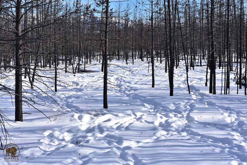 Buffalo tracks meander through the new burn, inside Yellowstone National Park, far from the usual migration corridor that family groups use. Photo by Stephany Seay, Buffalo Field Campaign.