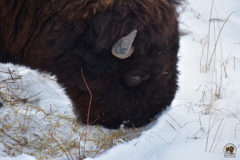 A bull buffalo finds life-giving grasses beneath the snow. Photo by Jaedin Medicine Elk, Buffalo Field Campaign.