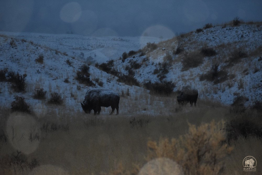 Bull buffalo graze peacefully, unfazed by the morning’s blizzard conditions. Photo by Stephany Seay, Buffalo Field Campaign.