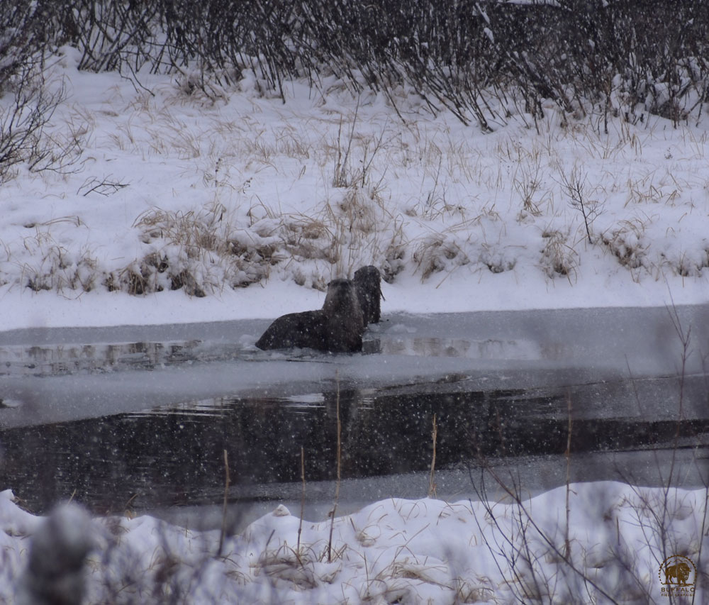 We have, however, had some wonderful wildlife encounters and amazing times on this wondrous winter landscape. Earlier in the week, temperatures plummeted into the negatives, one morning dipping down to -30, but this kind of cold, if you’re dressed right and moving, is really exhilarating to experience. On mornings like that, the willows, trees, and other plants along the creeks and rivers develop a glamorous hoar frost, every branch every stem coated in exquisite ice crystals. It almost feels like you’ve walked through the closet door and stepped into the fantastical realms of Narnia. And although we haven’t seen any buffalo up close and personal, we have had other amazing wildlife encounters with moose, river otters, trumpeter swans, elk, and others, and we have seen the fresh tracks of wolves, coyotes, foxes, ermine, and snowshoe hares. These wild lands never disappoint!