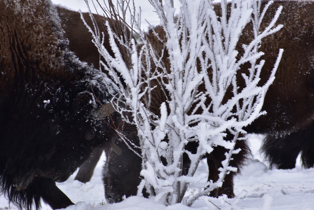 A buffalo scratches an itch on a frosty willow. Photo by Stephany Seay, Buffalo Field Campaign.