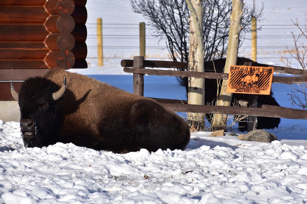 A young bull beds down next to one of our Buffalo Safe Zone signs put up by a homeowner in Yellowstone Village. Photo by Stephany Seay, Buffalo Field Campaign.