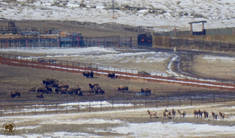 Wild buffalo captured within Yellowstone’s Stephens Creek bison trap. As of this writing, an estimated 90 buffalo have been shipped to slaughter and 14 have been held for domestication (quarantine) purposes. Notice the herd of elk outside of the trap. Ironic because the IBMP states they manage the buffalo this way because of (unfounded) fears they might spread brucellosis to cattle, when that has never happened, but elk have been implicated more than twenty-seven times in transmitting brucellosis to cattle and they are free to roam. Photo by Cindy Rosin, Buffalo Field Campaign.