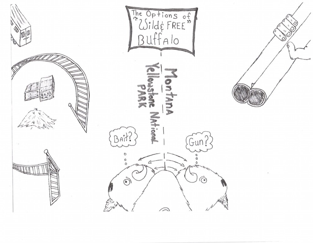 The “choices” the Interagency Bison Management Plan gives buffalo when they migrate into the Gardiner Basin. Artwork by Drazil, Buffalo Field Campaign.